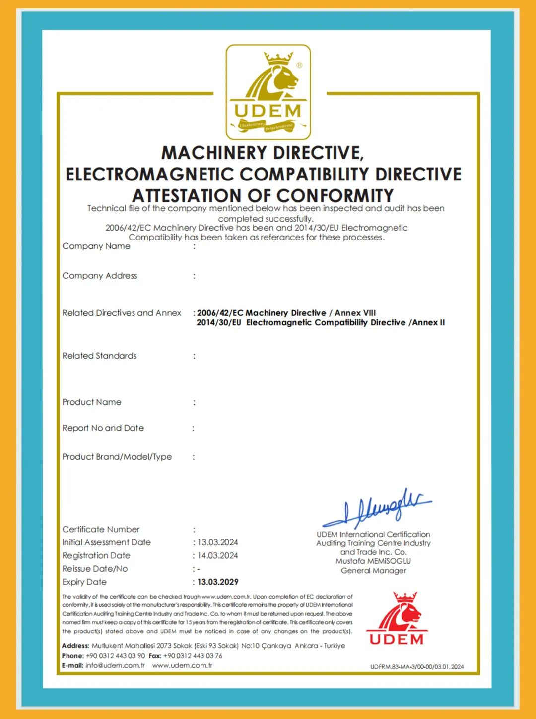 这张图非常具有教学意义。它虽然叫做 “Attestation of Conformity”,并引用了机械指令和EMC指令,但签发机构“UDEM”并非欧盟官方公告机构。