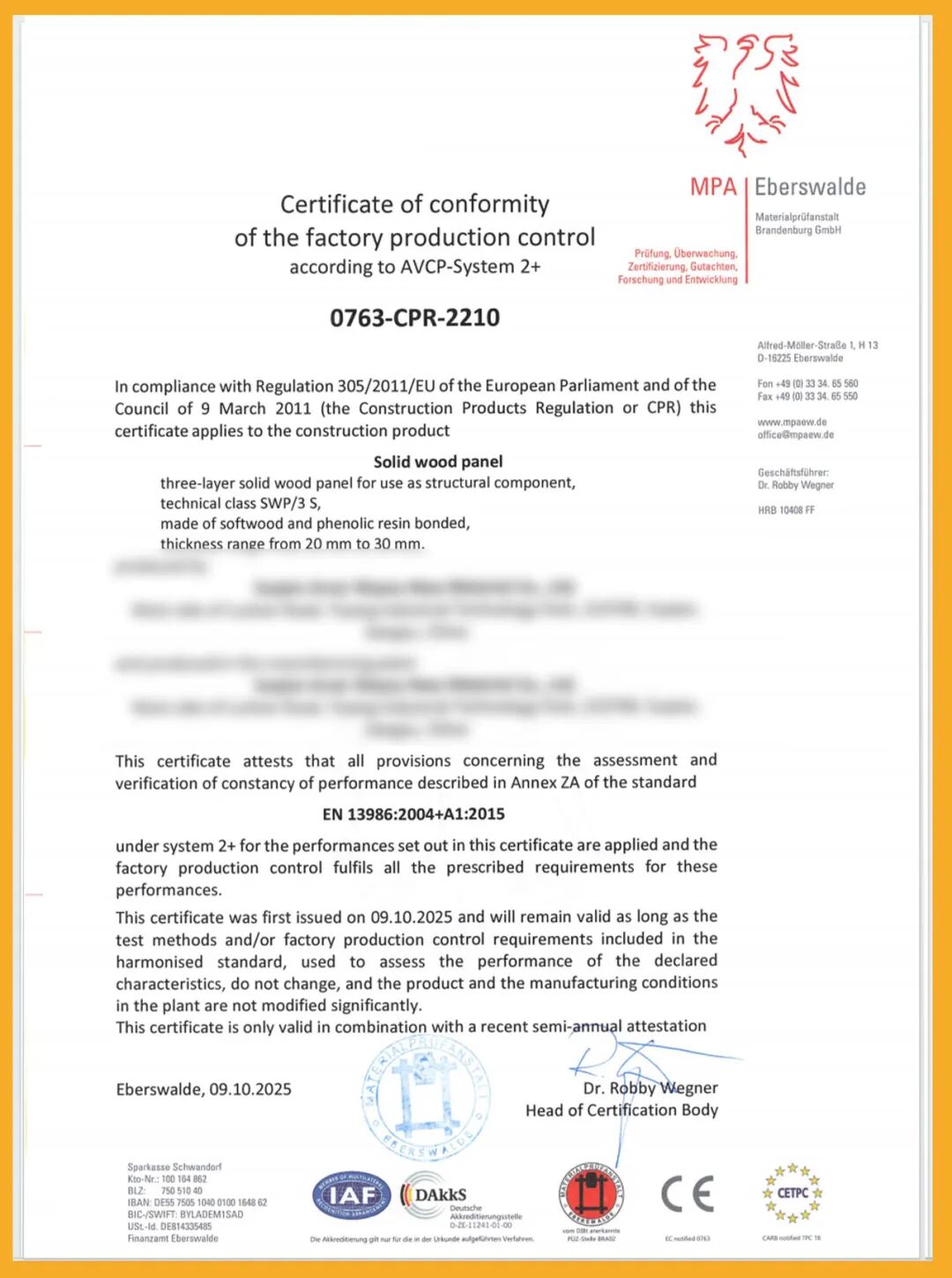 由欧盟公告机构签发的工厂生产控制符合性证书样图: